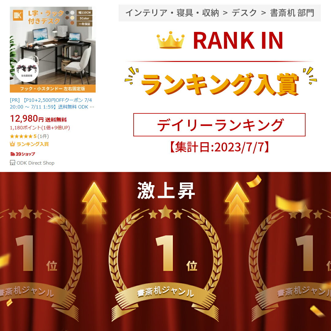 \15%オフクーポン配布 23:59まで/☆楽天30冠達成/送料無料 ODK 幅110cm デスク ラック付きデスク パソコンデスク 机 pcデスク モニター台付 L字型 l字デスク ゲーミングデスク PCデスク コーナーデスク 省スペース おしゃれ