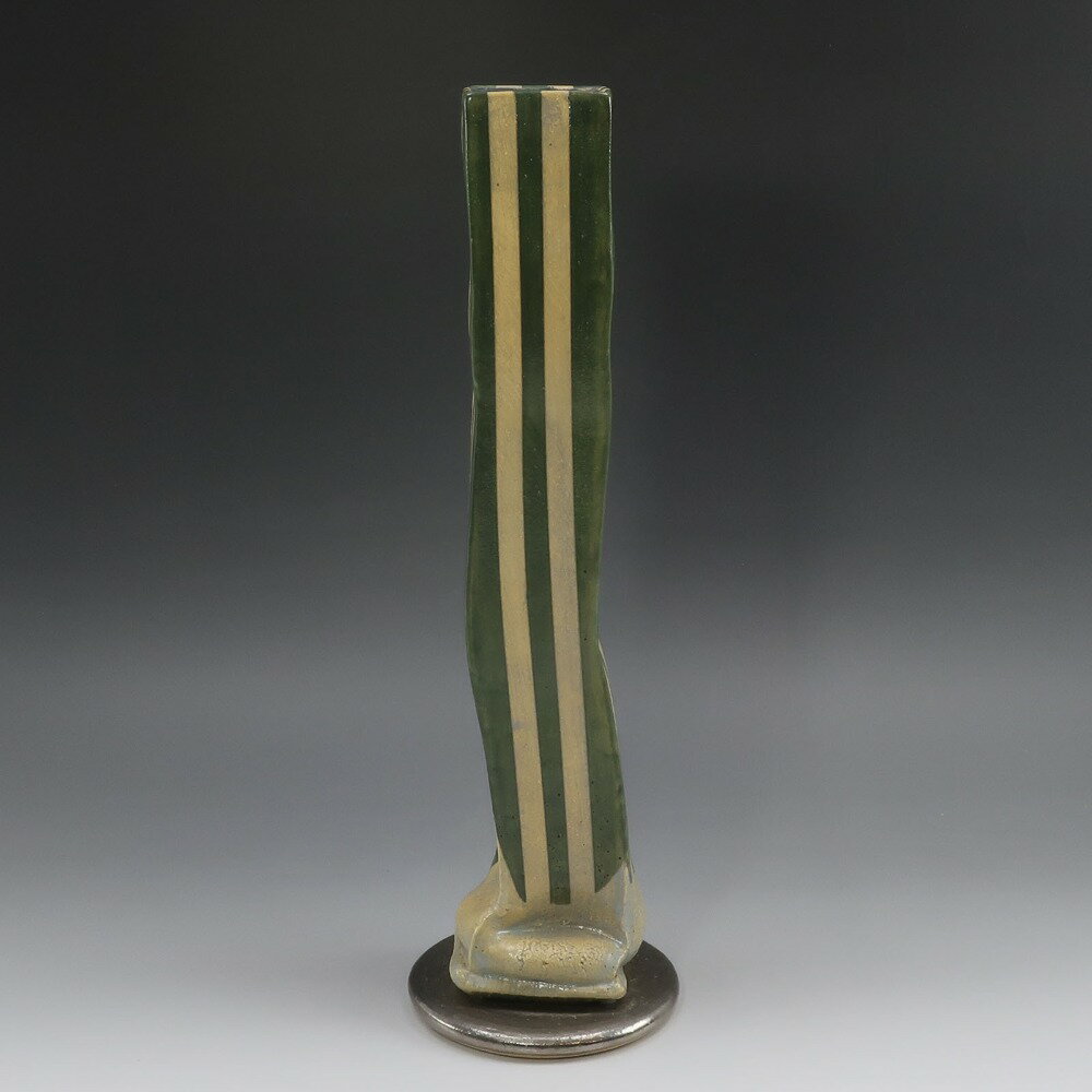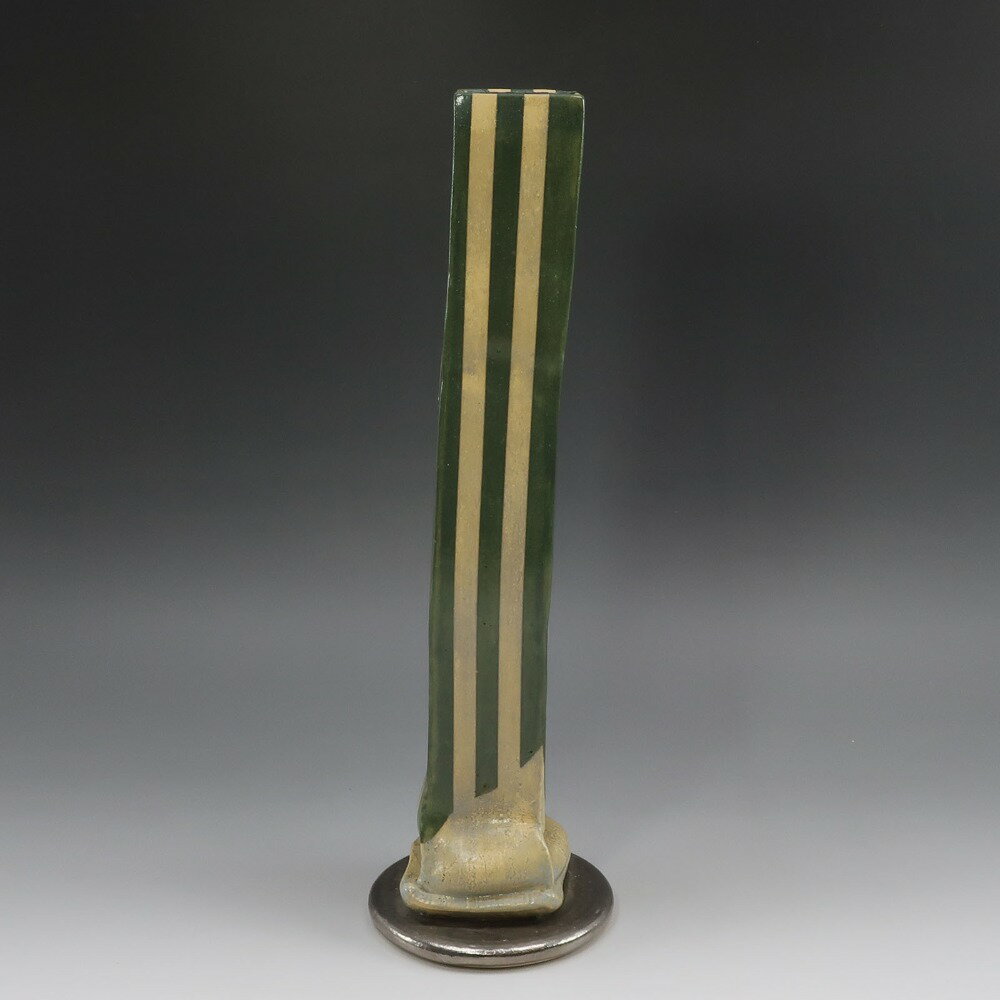 柳原睦夫 作 【 オリベ手 筒花瓶 】 花瓶 陶磁器 Oribe-style cylindrical vase by Yanagihara Mutsuo _【中古】Aランク