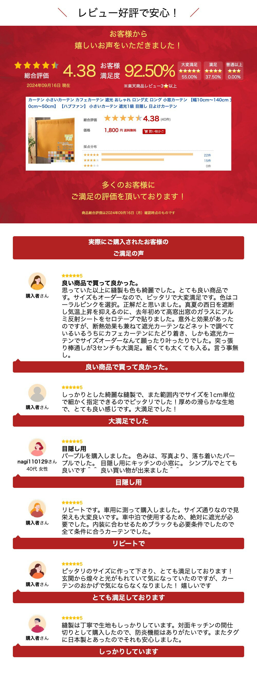 日差しや朝日がまぶしいところなどに、お手軽に突っ張り棒で取付けできます。 ウオッシャブルで洗濯可能。日本製。 カーテン上部、スソともにほつれにくい、高周波カットのカフェカーテン。 窓サイズは幅70~120cmの窓に適応します。 つっぱり棒はご用意下さい。 当店オリジナル商品です。 お好みのデザインをお選び下さい。在庫限りの商品ですので、お早めに。 ティファニー、アシュランス、プラムは遮光2級となり...