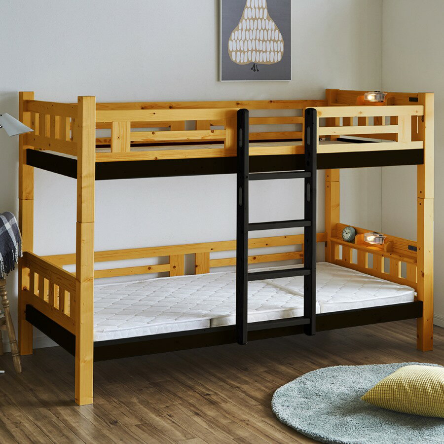 2段ベッド 薄型ポケットコイルマットレス付き ライトブラウン×ブラック 分割可 宮付き 棚付き コンセント付き 照明付き 木製【代引不可】