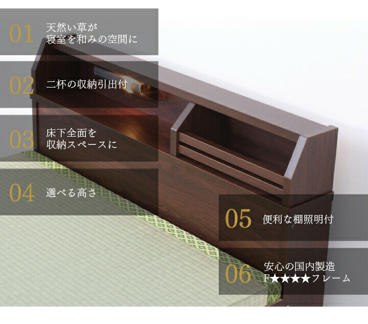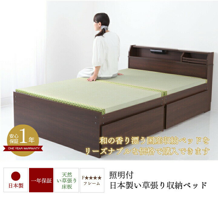 一人暮らし キャスター セミダブルサイズ ライト 日本製 収納付き たたみ 畳ベッド 照明付き 収納ベッド 木製 シンプル 棚付き セミダブルベット セミダブルベッド い草畳み 引き出し