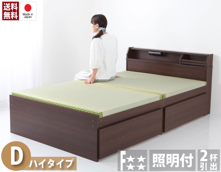 ベッド ダブルサイズ ダブルベッド 棚付き ライト 照明付き 日本製 い草畳み 収納 畳ベッド キャスター付き 引き出し 収納付き 木製 ダブルベット 一人暮らし シンプル 送料無料