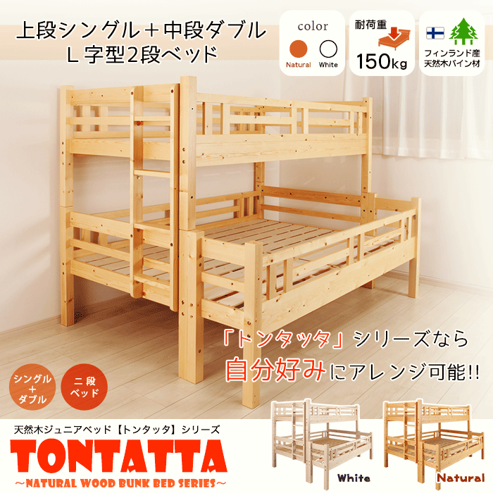 【商品詳細】 変則二段ベッド(シングル×ダブル) 様々な組み合わせが可能なキッズ用ベッド 二段ベッドで使ったり、分割して別々のお部屋でっ使ったりと、お子さんの成長に合わせて色々なレイアウトでご使用いただけます この組み合わせは、下段ベッドがダブルサイズ・上段ベッドがシングルサイズと、上下でサイズの違う変則タイプのセットです 添い寝が必要な小さなお子さんと寝る場合や、体の大きなお父さんが寝る場合等、...