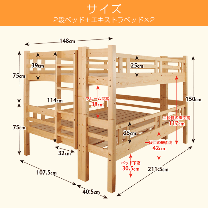 ▼2段ベッド説明▼ ▼ 布団セット詳細▼ ▼ 二段ベッドの単品販売はこちら ▼ ▼ 布団セットの単品販売はこちら▼ ▼より高品質な二段ベッドとのセットもございます▼ 九州産ひのき二段ベッド布団7点セット送料無料 165,800円 ベッド 仕様サイズ 外寸:幅111(はしご含む)×長さ210(フック含む)×高さ134.5cm床板部内寸: 98×199cm 支柱の太さ:6×6cmフレームの厚み:1.8...