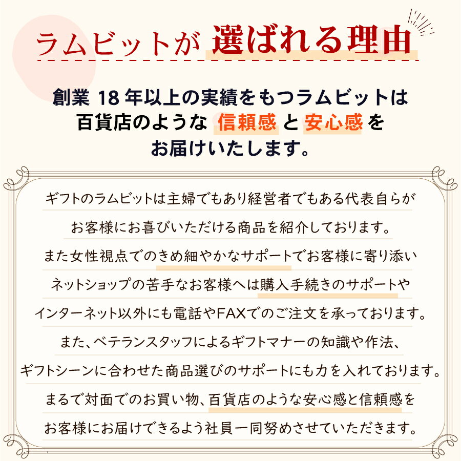 こちらの商品の配送について★北海道・沖縄・離島は配送不可となります。こちらの商品の包装(ラッピング)について○ラッピング・のし承ります(有料)。○「のし種類」と「のし名入れ」はご注文時備考欄にご記載下さい。(のしはラッピングと一緒にご注文下さい。のしのみのご指定は不可となります。)注文者名とお届け先名が異なる場合は「(注文者名)様ご依頼分」と送り状に記載して発送いたします。★ラッピング・のしをご指...