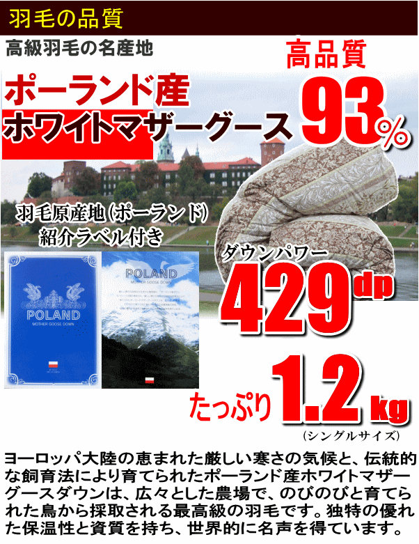 こだわりの国産品。ポーランド産ホワイトグースをシングルは1.2kgも使用した高級感あふれる羽毛布団です。品質はロイヤルゴールドラベル、品質保証書付きの羽毛布団です。かさ高165mm以上でふんわり、側生地も超長綿でツヤツヤ、最高級の羽毛布団です。 サイズ シングル:150cm X 210cm 組 成 側生地:綿100% (超長綿) 中身:ポーランド産ホワイトグース (マ...