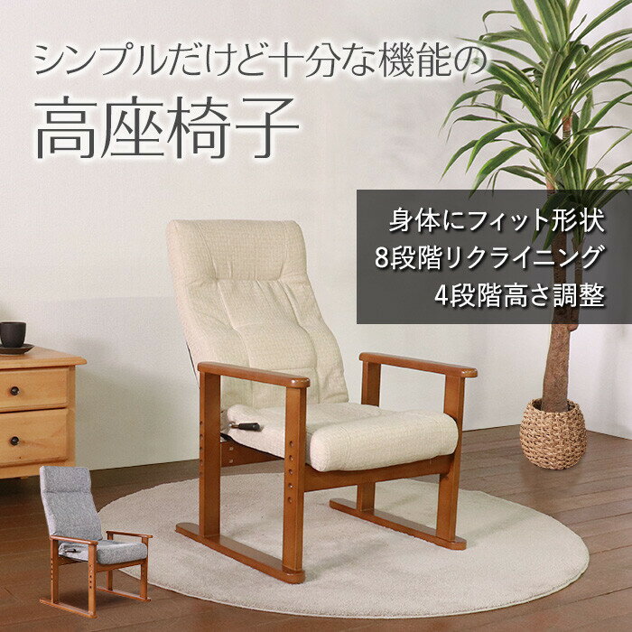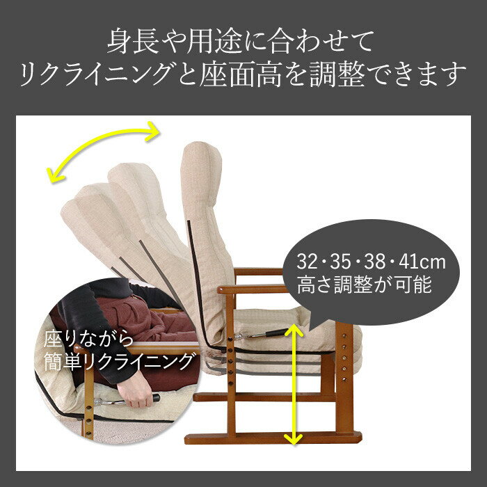【商品名】シンプルだけど十分な機能の高座椅子 【サイズ】幅57.5×奥行55~90×高さ94×座面高32・35・38・41cm 【重 量】約6kg 【カラー】ベージュ 【素 材】 構造部材:金属(鉄)、天然木 張り材:ポリエステル100% クッション材:ウレタンフォーム、ポリエステル綿 【生産国】中国 【特 徴】 01.背もたれは座ったまま操作できる手元レバー式8段階リクライニング。 0...