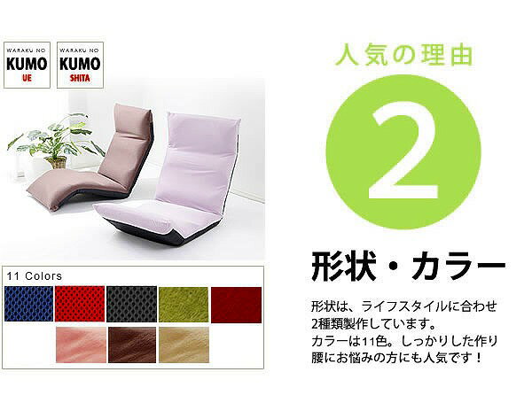 極上の座り心地。 長時間座っていてもつかれにくい座椅子。 UEとSHITAの、2タイプ。 各タイプ11色の豊富なカラーバリエーションよりお選びいただけます。 商品名座椅子 サイズ上 幅54×奥行73〜138×高さ11.9〜70cm 下 幅54×奥行93〜138×高さ11.9〜70cm 重量:約8kg 材質表地:ポリエステル100% 裏地:ポリエステル100%、発泡ウレタン、 チップウレタン、綿、金...