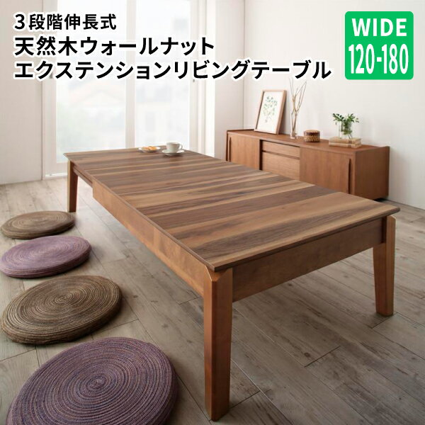リビングテーブル 伸縮式 伸縮テーブル ローテーブル 奥行75 センターテーブル 3段階 伸長式 幅120-180 天然木ウォールナットエクステンション 新生活