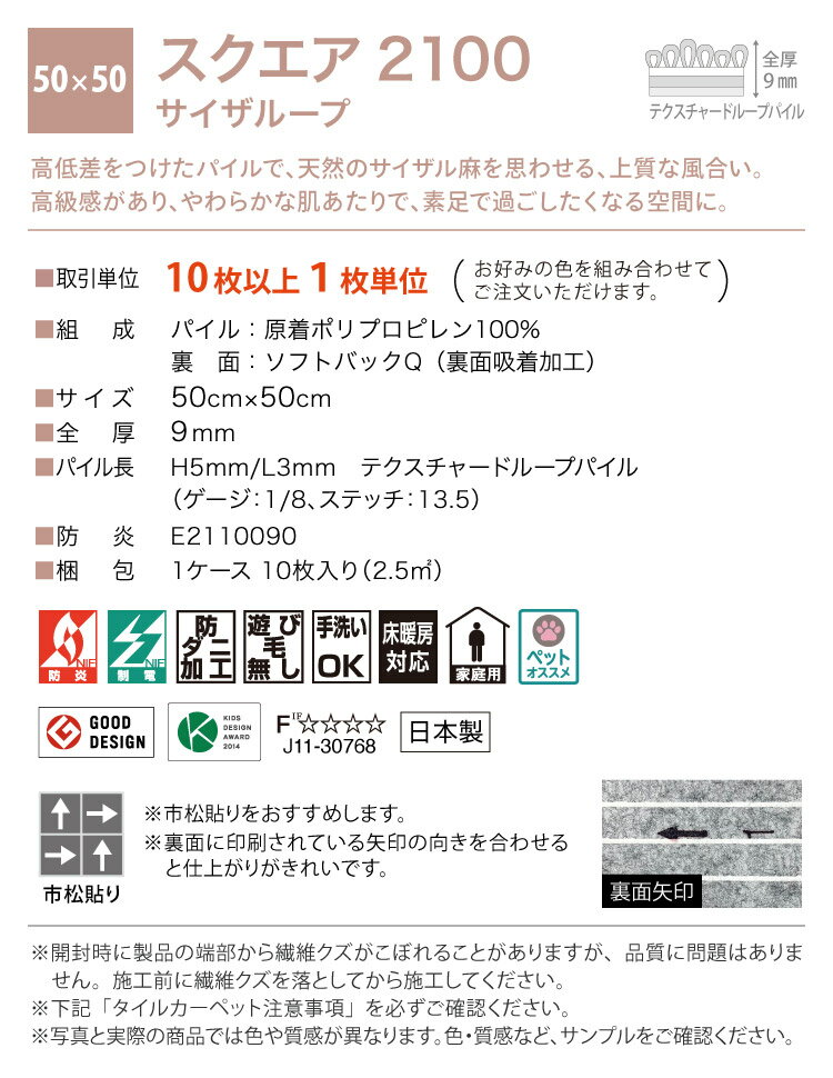 メーカー希望小売価格はメーカーカタログに基づいて掲載しています ■商品詳細 メーカー/品名 東リ / ファブリックフロア スクエア2400 ソワレ サイズ 50cm×50cm角 全厚10mm 原産国 日本製 材 質 パイル:BCFナイロン100% (パイル長7mm カットパイル) バッキング:ソフトバックQ(裏面吸着加工) 特長 汚れた部分だけ取外して気軽に洗えるタイルカーペット。吸着式の滑り止め...