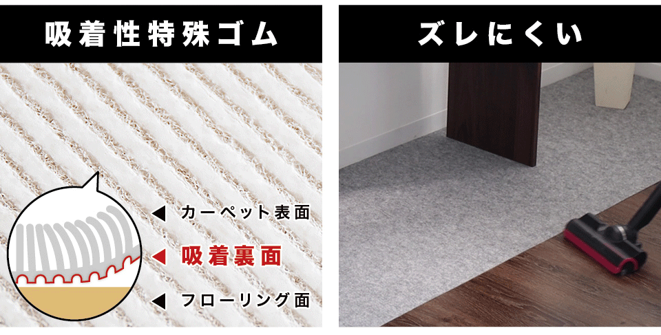 この商品は沖縄・離島は配送不可となります。配送先が不可地域に該当する場合は誠に申し訳ございませんが、ご注文キャンセル処理させていただきます。■商品説明セット内容:ロールカーペット 幅60cm 長さ300cm裏面は特殊吸着加工で床にピタッと吸着。簡単に外せて跡も残りません。目に見えない無数の気孔があり上から力が加わると空気が抜けて真空状態になります。それが無数の吸盤となり、くっつく仕組みです。吸盤の...
