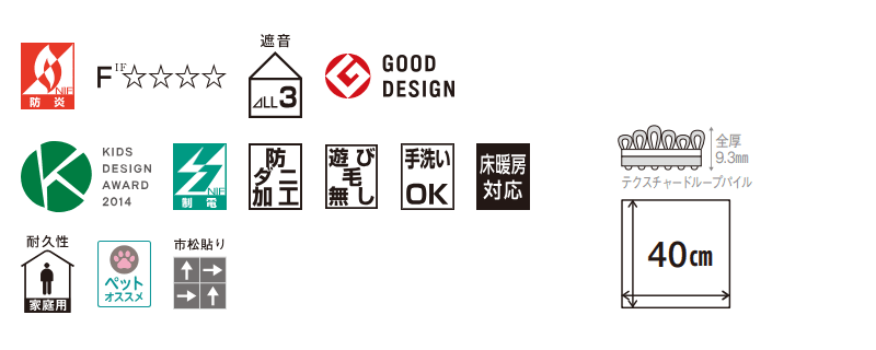 商品名アタック950NE吸着・洗える・防ダニのファブリックフロアです。商品データ●サイズ:40cm×40cm●全厚:9.3mm●パイル長:H5mm〜L3mm(テクスチャードループパイル)●パイル組成:原着ポリプロピレン100%●ゲージ:1/8●ステッチ:12.5●梱包(1ケース):10枚/ケース(1.6m2)●バッキング:ソフトバックQ(裏面吸着加工)●防炎試験番号:E2240120●ホルムアルデ...